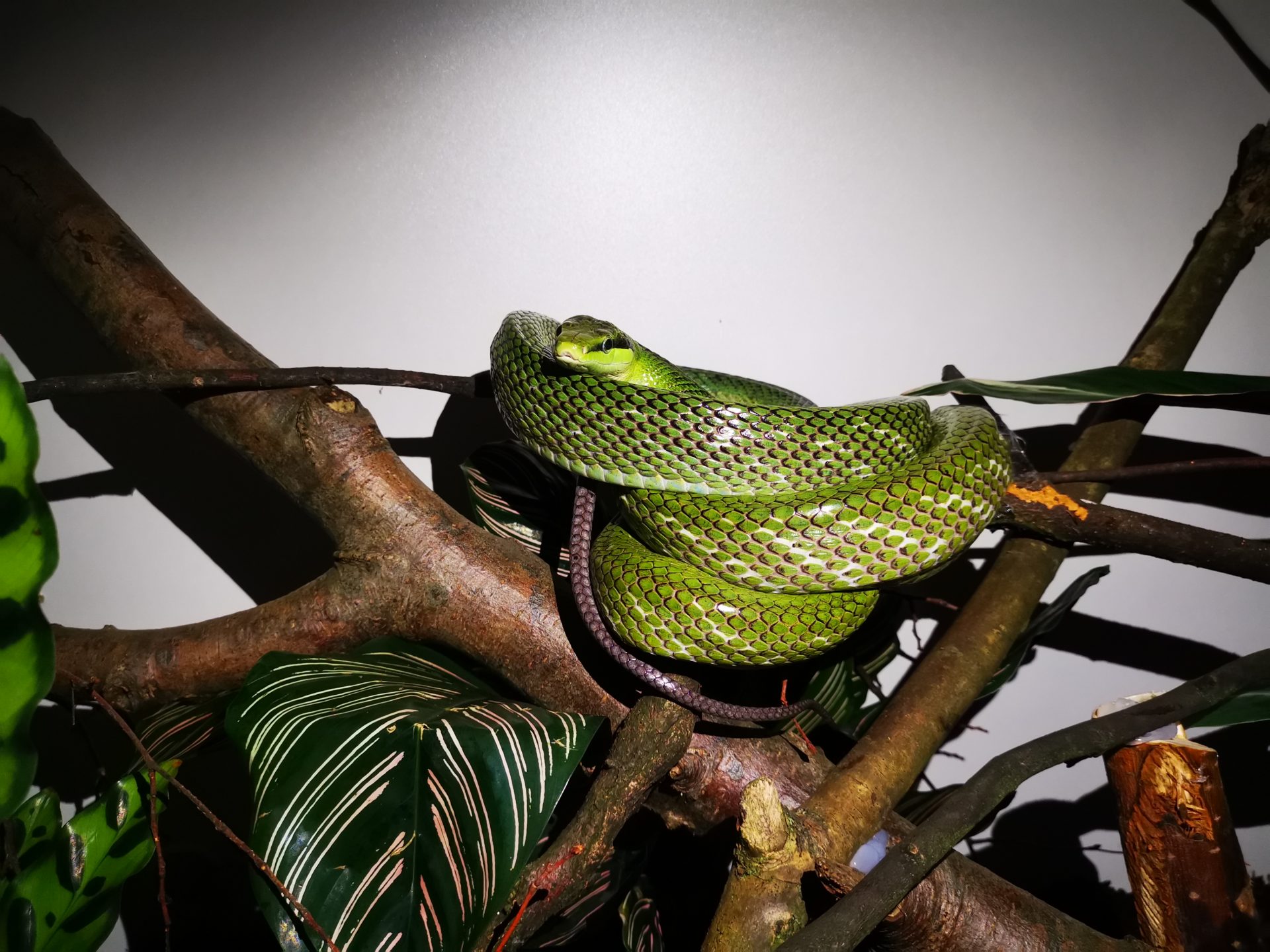 Aufgrund der Lebensweise sind die Schuppen verhältnismäßig groß und sehr rau. Das kann beim Klettern sehr hilfreich sein. Da sie überwiegend in den Baumwipfeln zuhause ist.